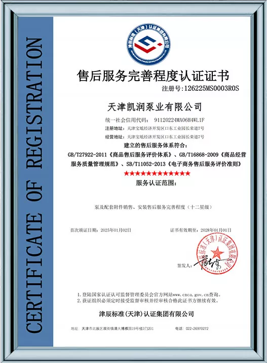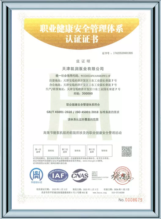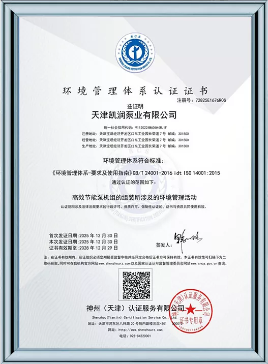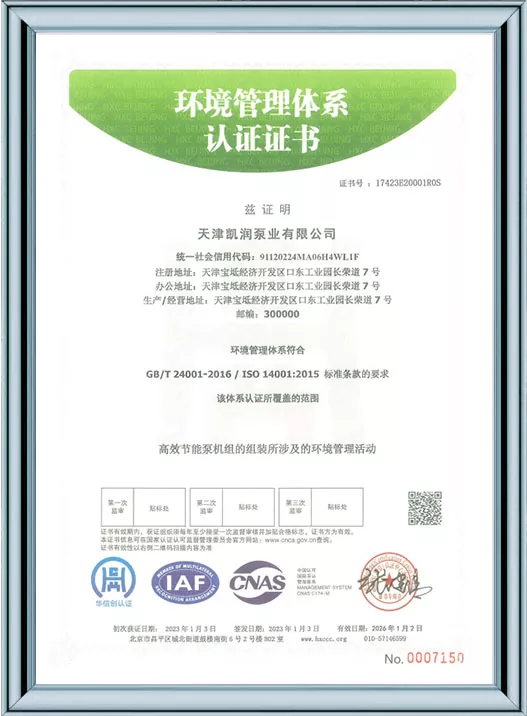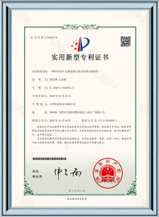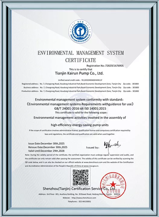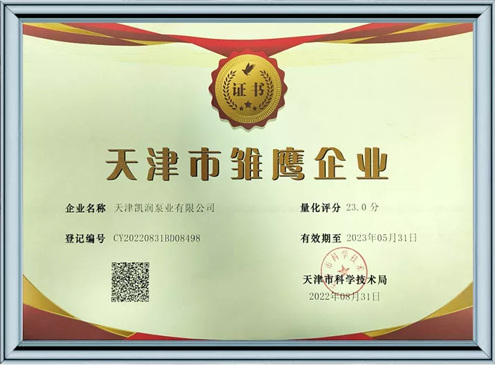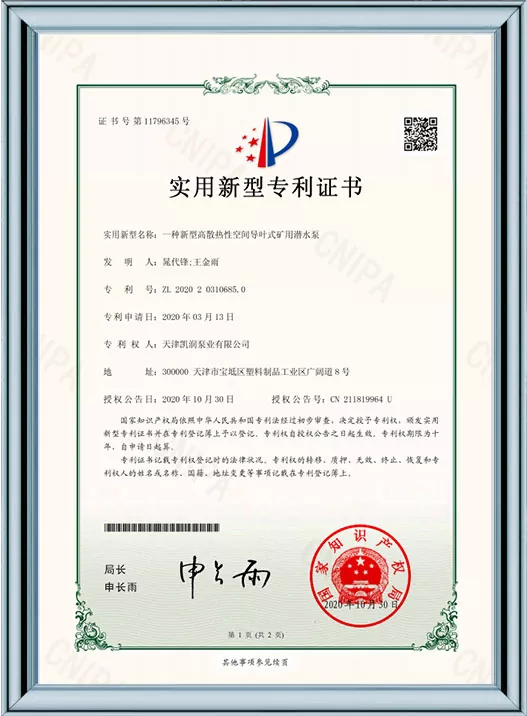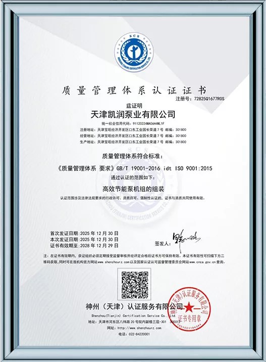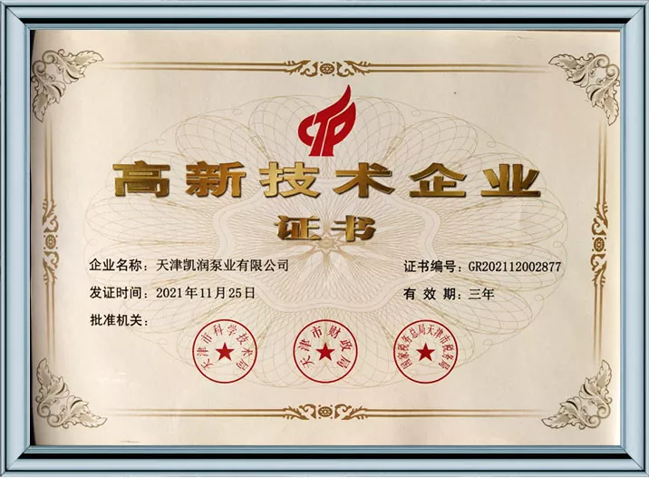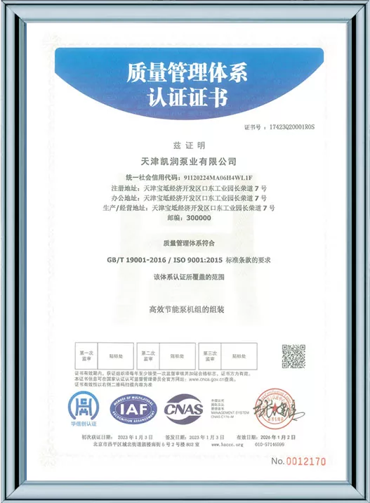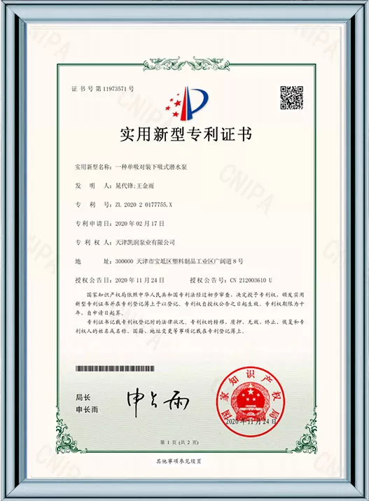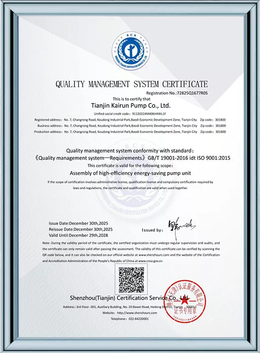 Каирун Пумпс је дубоко посвећен технолошким иновацијама и стандардизованом менаџменту, пошто је добио 41 патент за корисни модел и био је препознат као предузеће високе технологије и предузеће за младе орлове у Тиањину. Кроз пролазак више ауторитативних сертификата, укључујући управљање квалитетом ИСО9001, управљање здрављем на раду, управљање животном средином и свеобухватну постпродајну услугу, Каирун Пумпс демонстрира своју водећу снагу у индустрији и осваја поверење глобалних купаца својим робусним портфолиом патената и свеобухватним квалификацијама за усклађеност!